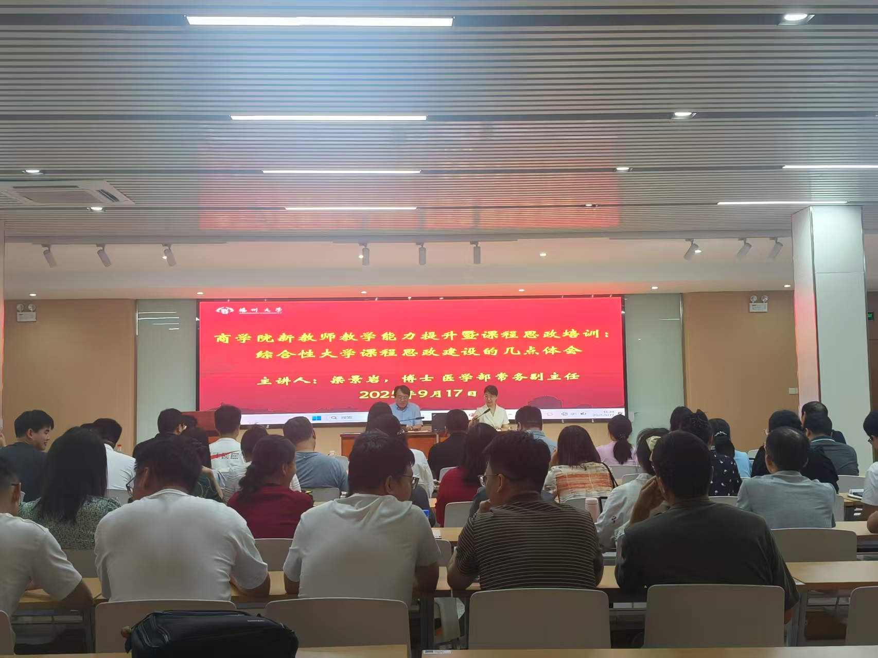 为全面提升新教师教学水平,深化课程思政育人实效,9月17日,学院在新行政楼一楼报告厅举办“新教师教学能力提升暨课程思政培训”活动。本次活动特邀扬州大学医学部常务副主任梁景岩教授担任主讲嘉宾。院党委书记解小青主持会议。教学副院长黄春燕出席会议。青年教师和全体教工党支部书记共70人参加。