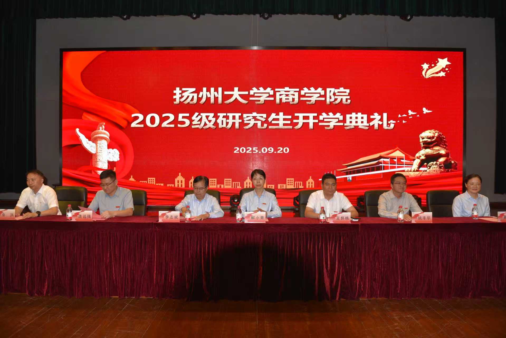 9月20日下午,商学院2025级研究生开学典礼在扬子津文体馆三楼报告厅隆重举行。院党委书记解小青、院长李志斌、党委副书记姚丰华、副院长连远强、副院长黄春燕、五级职员余洪老师以及特邀嘉宾商学院杰出校友常州厚德新能源集团有限公司董事长王怀栋出席典礼。2025级研究生各班班主任、学科秘书、教师代表、学生代表、研究生学工办和各专业学位教育中心全体人员,以及2025级321名研究生参加大会。典礼由副院长连远强主持。