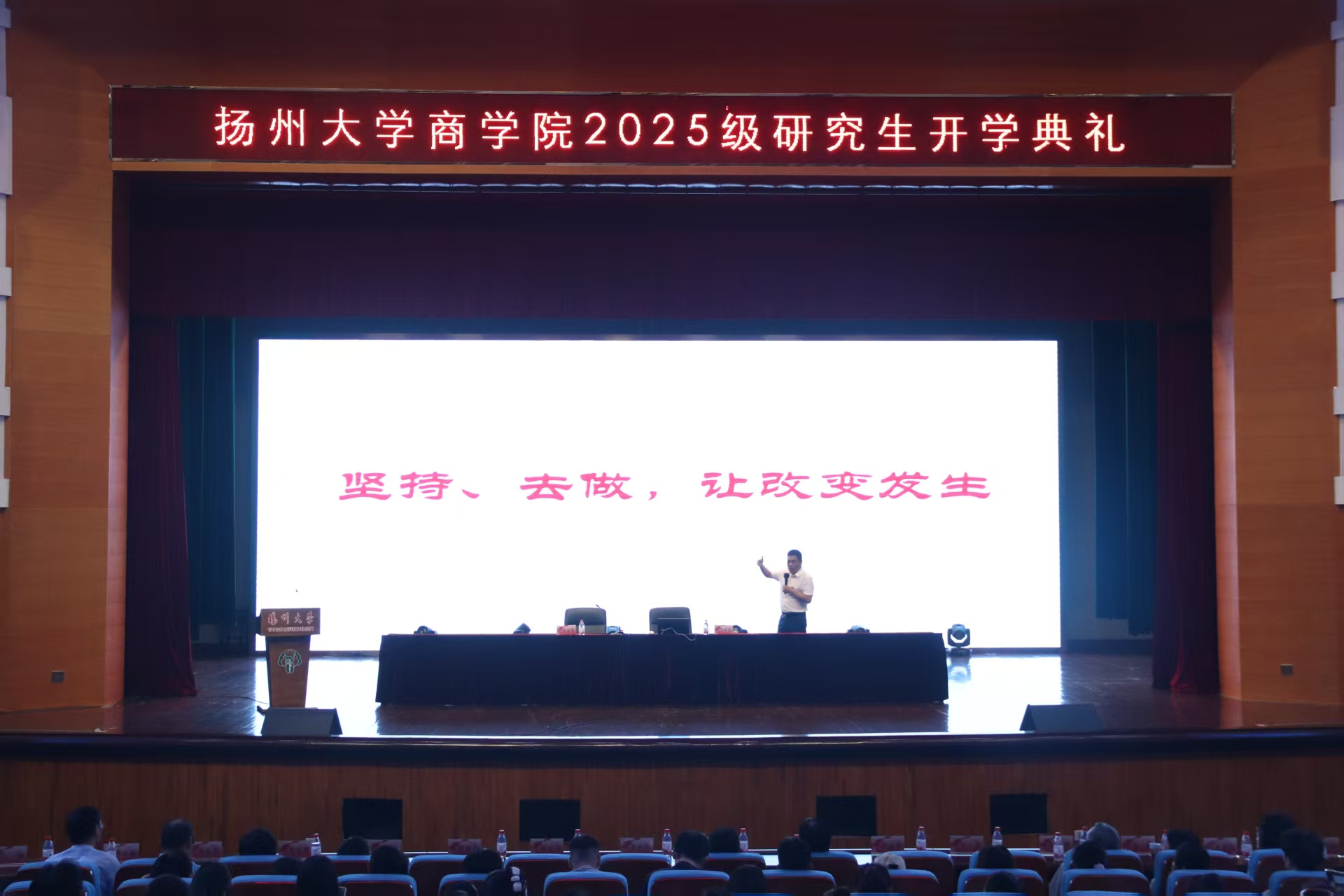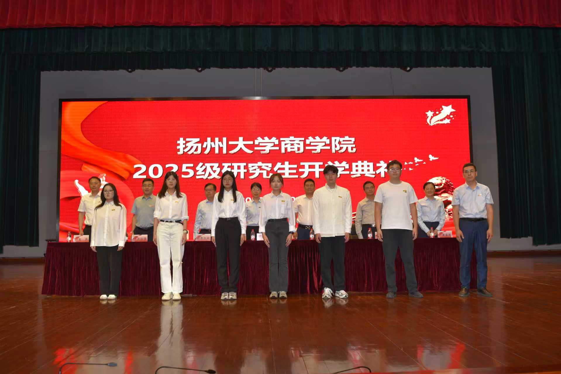 开学典礼上半场在庄严的国歌声中拉开序幕。院党委书记解小青、院长李志斌为2025级博士研究生田昊东、张博群佩戴校徽,在主席台就坐的领导嘉宾为硕士生新生代表佩戴校徽,标志着同学们正式成为扬州大学商学院的一员,开启了人生新篇章。典礼上,李志斌院长发表迎新致辞,他全面介绍了商学院的办学理念、教育体系、师资力量、学生规模,全方位展示了学院近年来在研究生人才培养上的累累硕果,重点强调研究生阶段对学术生涯与人生发展的关键意义,鼓励新生珍惜韶华、潜心治学。商学院导师代表孙璐老师、全日制老生代表蒋元源同学、非全日制老生代表杨景辉同学、全日制博士研究生新生代表张博群同学、非全日制新生代表唐怡萱同学先后发言,凭借独到的见解与真切的情绪传递观点与体会,既为新生点亮了成长方向,也激励着现场每一位同学开拓进取、不断推动自己向更高的目标迈进。开学典礼上半场在扬州大学校歌与热烈的掌声中落下帷幕。开学典礼仪式凝心聚力、催人奋进,不仅让新生们感受到学校的温暖与关怀,更明确了未来的学习与成长方向,为他们开启研究生生涯注入了精神动力。