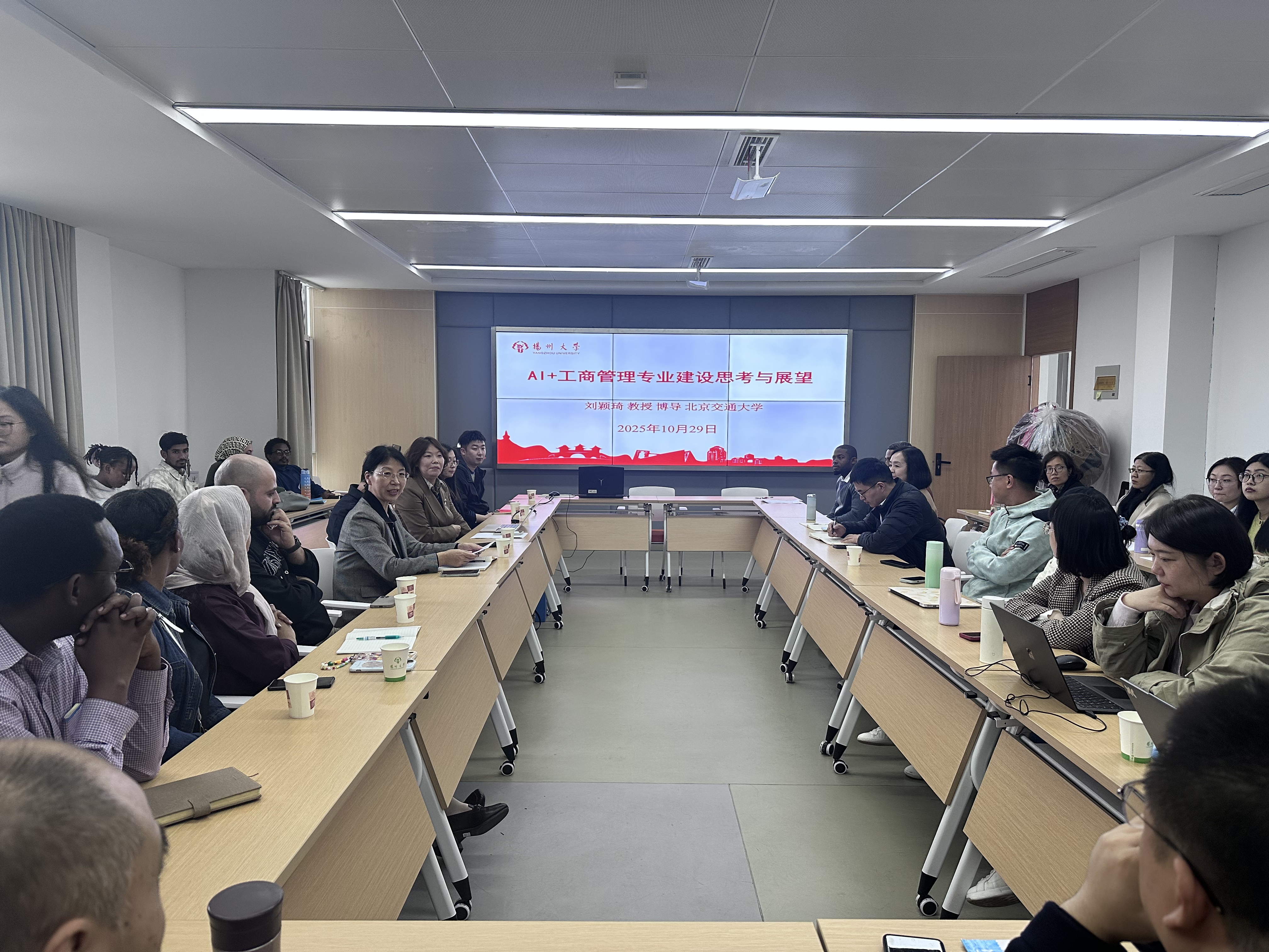 刘颖琦教授从师资队伍、团队建设、专业定位和专业优势等多个方面,系统介绍了北京交通大学工商管理专业的发展现状,重点分享了在人工智能背景下该专业课程体系的创新设置,以及深化产教融合的具体举措。在交流环节,刘教授还围绕工商管理专业建设的相关问题,与我院教师展开了深入探讨。
