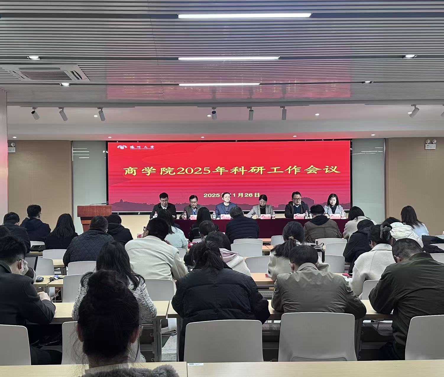 王金铨处长充分肯定了商学院2025年及“十四五”期间科研取得的成绩,对学院2026年国家项目的申报工作提出指导。希望学院进一步强化交叉融合,打造好学科发展的新优势;进一步加强科研团队建设,激发有组织科研的新动能;进一步引领数字技术革命,探索科研范式新形态。