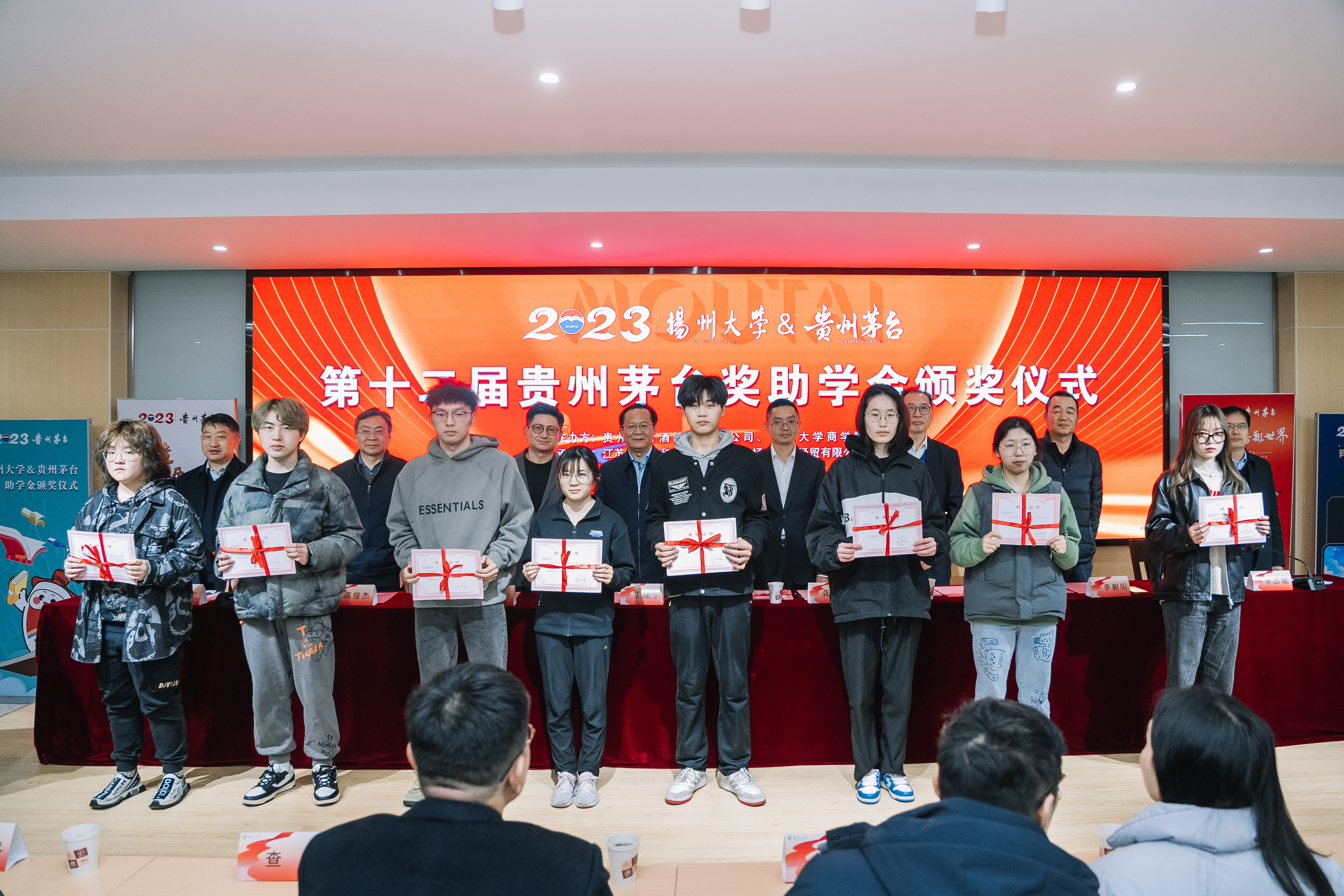 3月23日下午,第十二届贵州茅台奖助学金颁奖仪式在扬州大学商学院一楼报告厅隆重举行。本次活动由贵州茅台集团和扬州大学商学院主办,江苏中糖德和经贸有限公司、扬州风正经贸有限公司联合承办。扬州大学校长丁建宁,贵州茅台酒销售有限公司江苏省区经理龚艺桂、江苏中糖德和经贸有限公司董事长张卫校友、总经理李朝阳校友,扬州风正经贸有限公司董事长徐谨校友,扬州大学校长办公室主任龚俊杰,商学院院长李志斌,贵州茅台江苏省经销商代表出席本次活动。商学院党委书记孟益宏主持仪式。