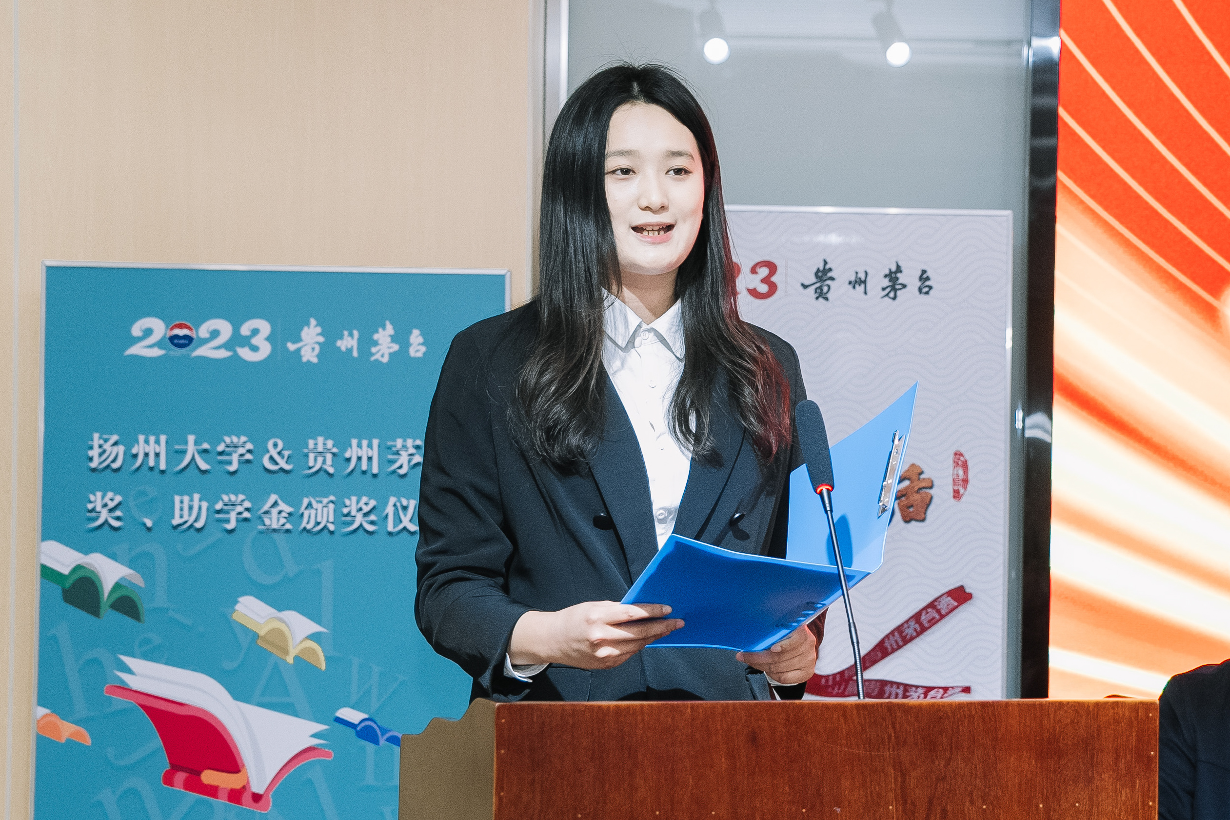 商务2002马欣言同学代表获奖同学发言。她对茅台集团和一直以来关心同学们学习与生活的师长们表示感谢,呼吁同学们在新的一年乘风破浪,不负时代,不负梦想,不负奋斗路上的引路人。她提出要以现场的优秀校友为榜样,用奋斗书写青春,用实干成就事业,用感恩回报学校,立志做有理想、敢担当、能吃苦、肯奋斗的新时代好青年。